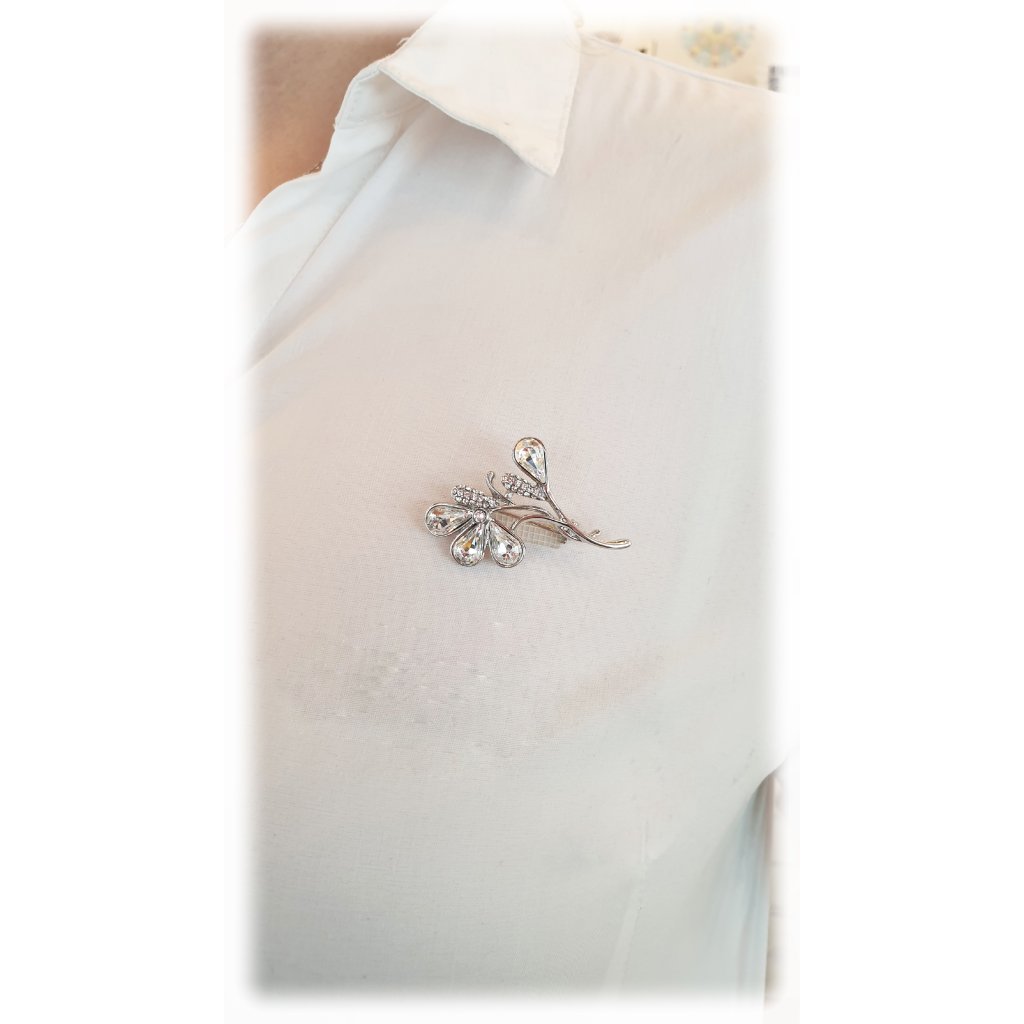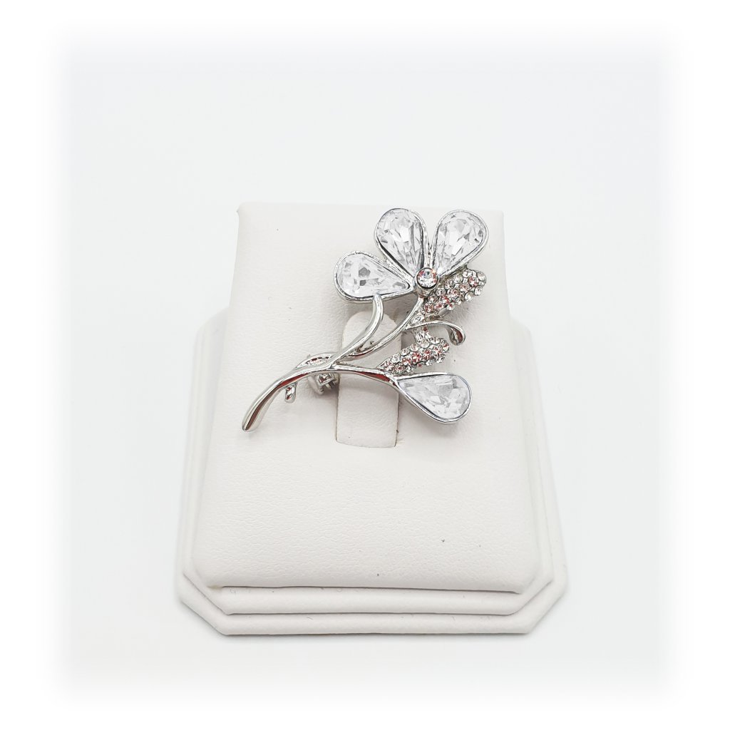Brož jablonecké bižuterie, s kameny Swarovski® osázenými do tvaru květiny v barvě Crystal (čirá). Povrchová úprava Rhodium pro vyšší odolnost a lesk. Zavírání na špendlík.