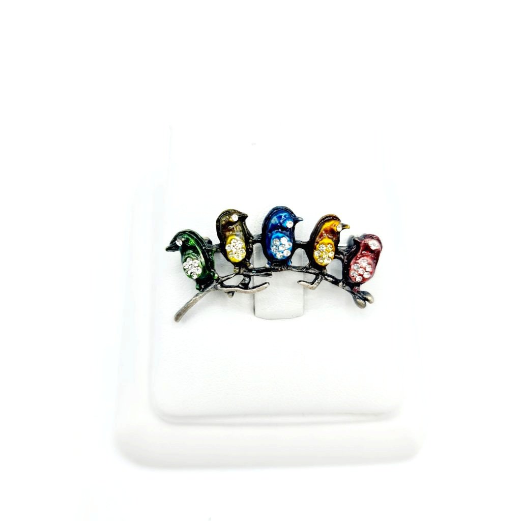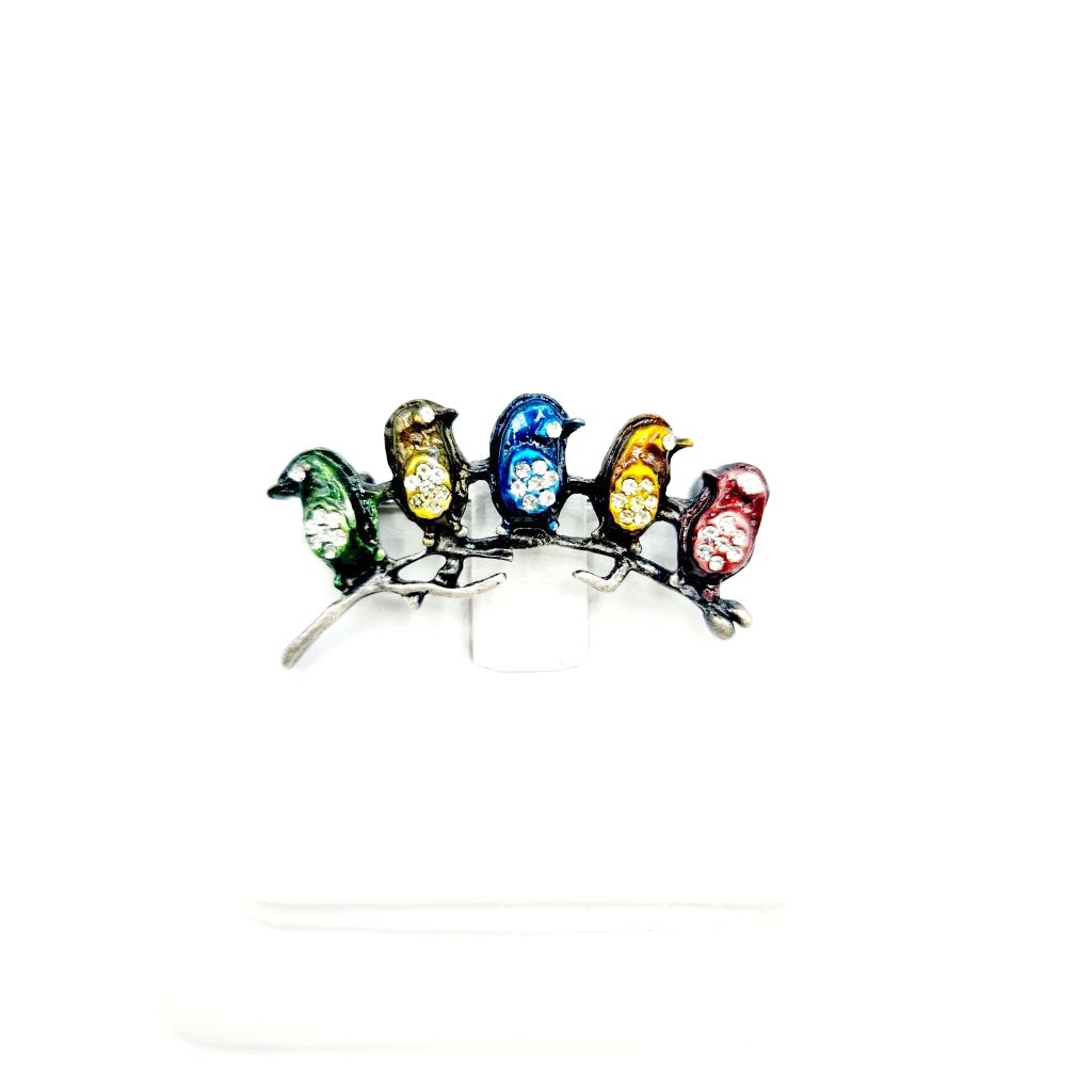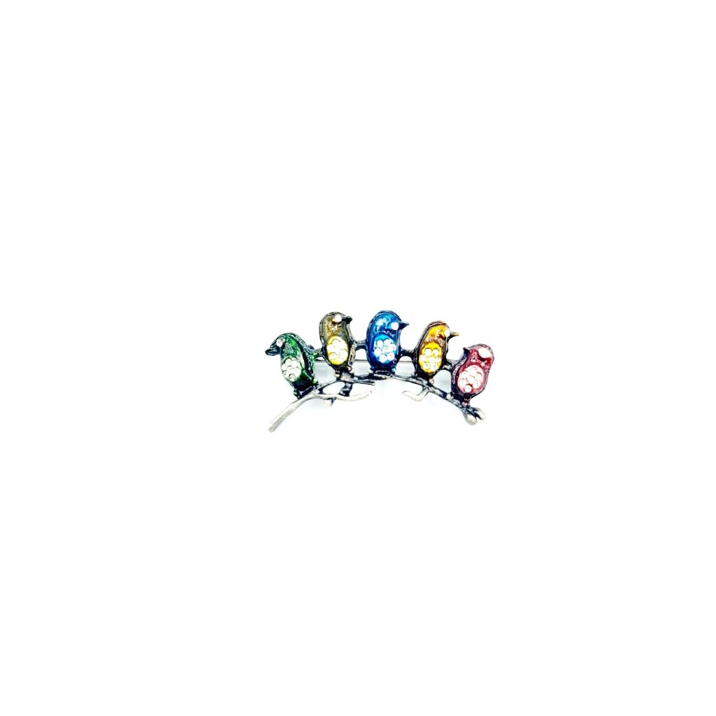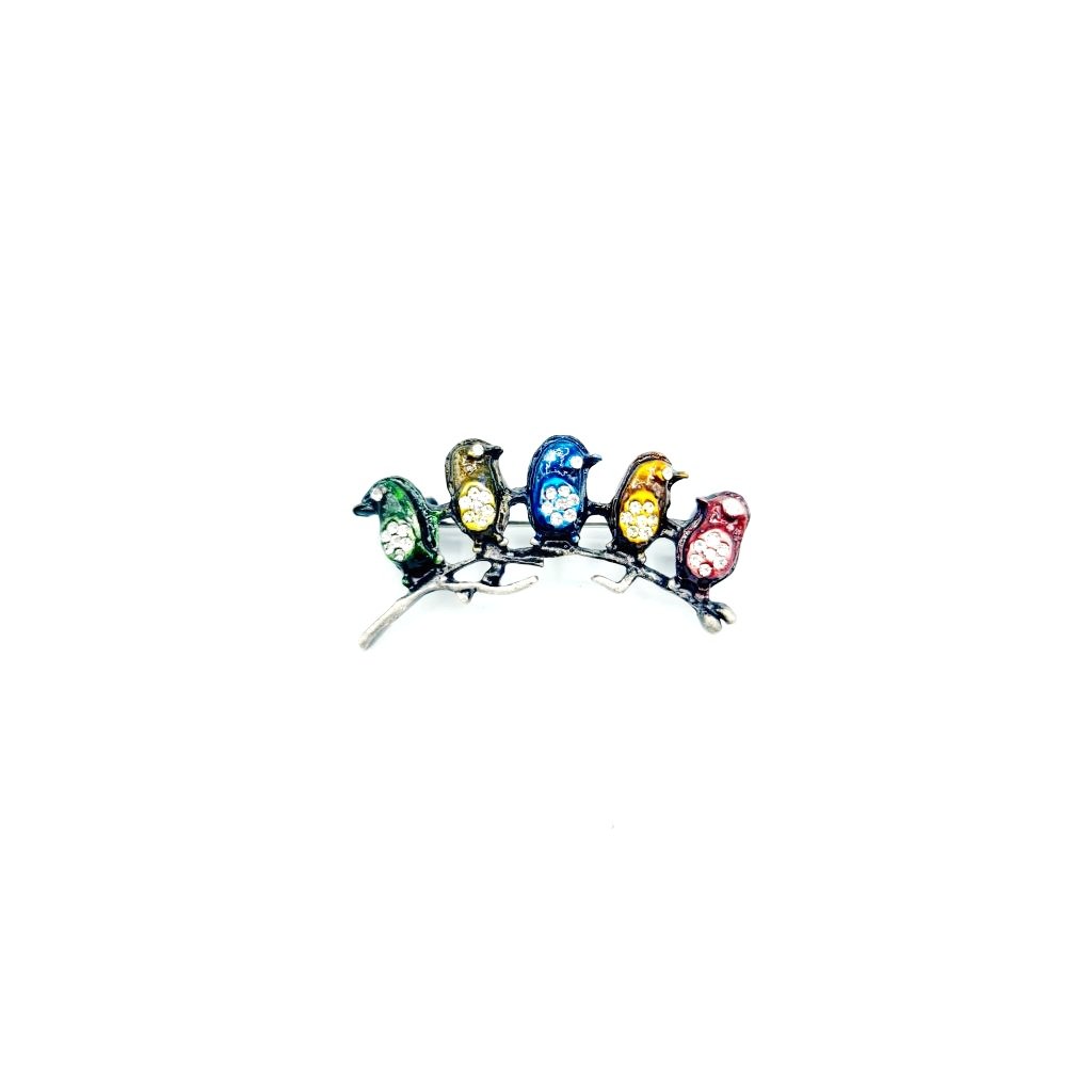 Přineste do svého šatníku kousek umělecké elegance s naší ručně malovanou broží s motivem ptáčků na jemné větvičce. Každá brož je pečlivě osázena třpytivými kameny Preciosa, které dodávají šperku jemný a sofistikovaný lesk.