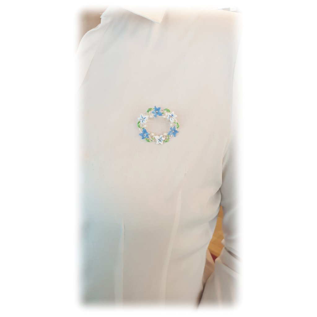 Krásná jarní/letní brož plná květin bude krásnou ozdobou pro Váš outfit. Zářivá a elegantní Brož věneček potěší nejednu milovnici květin. Lze ji použít na šálku, kterou protáhnete skrz věneček a tím získáte originální módní doplněk.