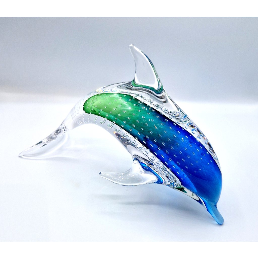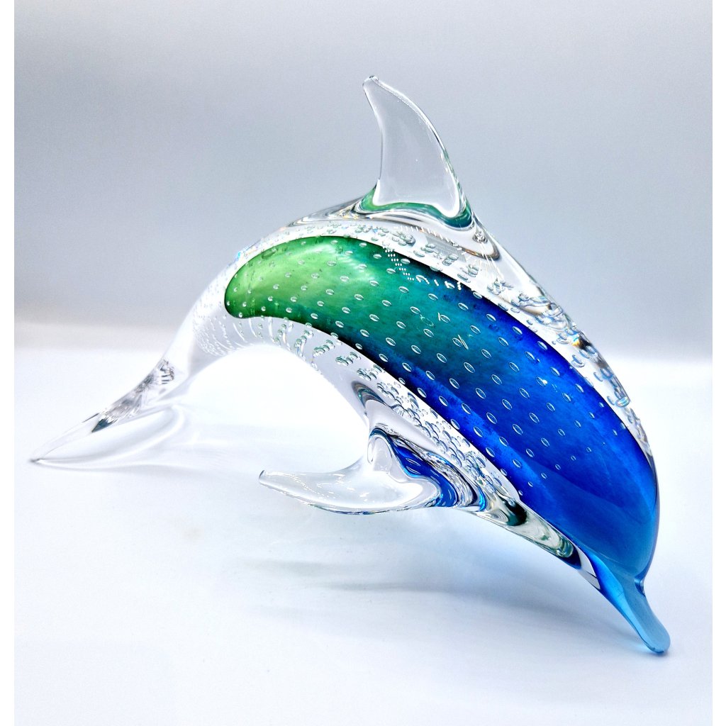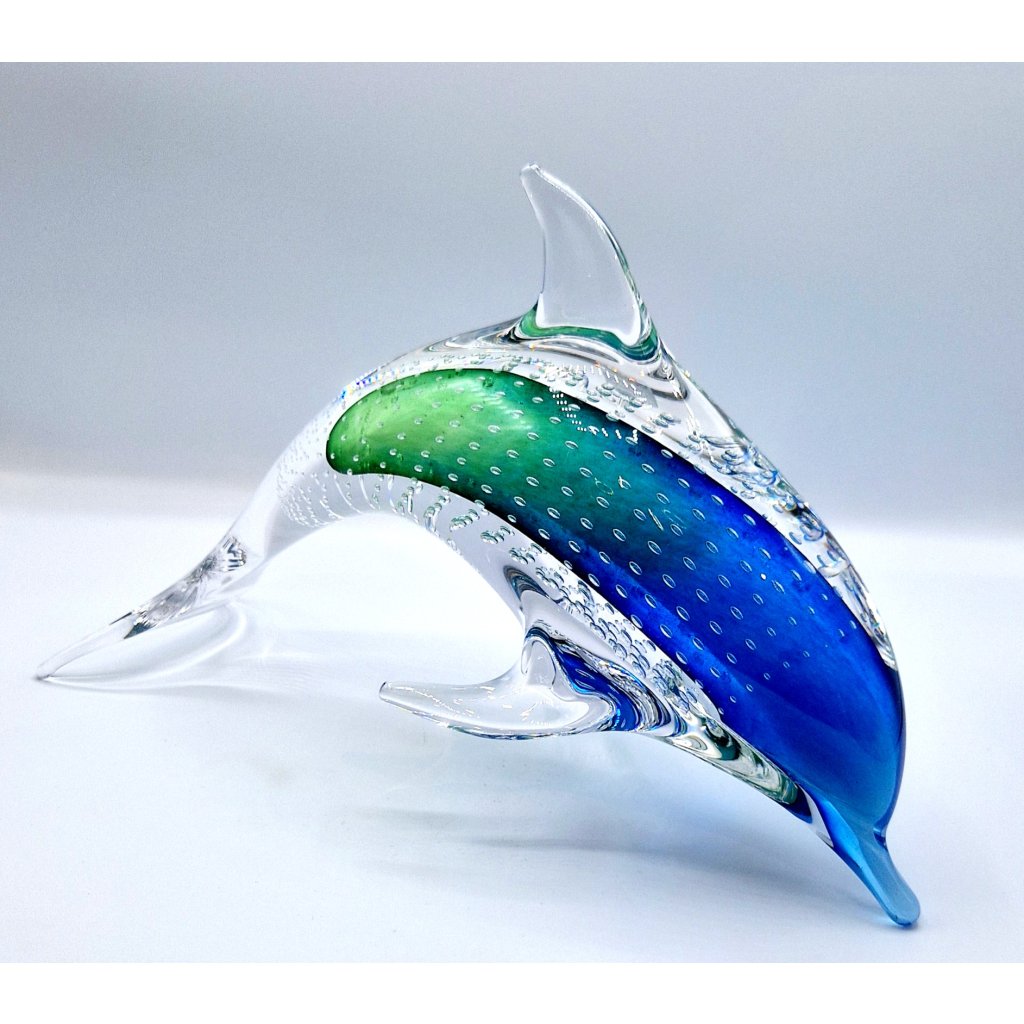 Skleněný delfín z hutního skla s bublinkami je elegantní dekorace, která kombinuje uměleckou ruční práci s jedinečnými efekty. Bublinky uvnitř skla vznikají speciální technikou, která dodává figurce živost a hloubku.