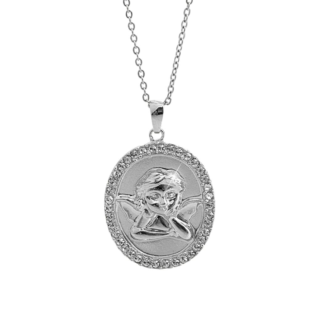 Náhrdelník Medailon s Andílkem je jablonecká bižuterie s povrchovou úpravou rhodium. Tato povrchová úprava je zárukou kvality šperku, chrání ho před oděrem a nebude černat. Zároveň je díky této úpravě antialergenní. Náhrdelník má dlouhý řetízek, což ocení dámy s větším dekoltem.Medailon je osázen kameny Swarovski v barvě crystal, díky němuž je nádherně zářivý. Náhrdelník je navržen a vyroben mladou jabloneckou šperkařkou, která do něj vložila své umění.