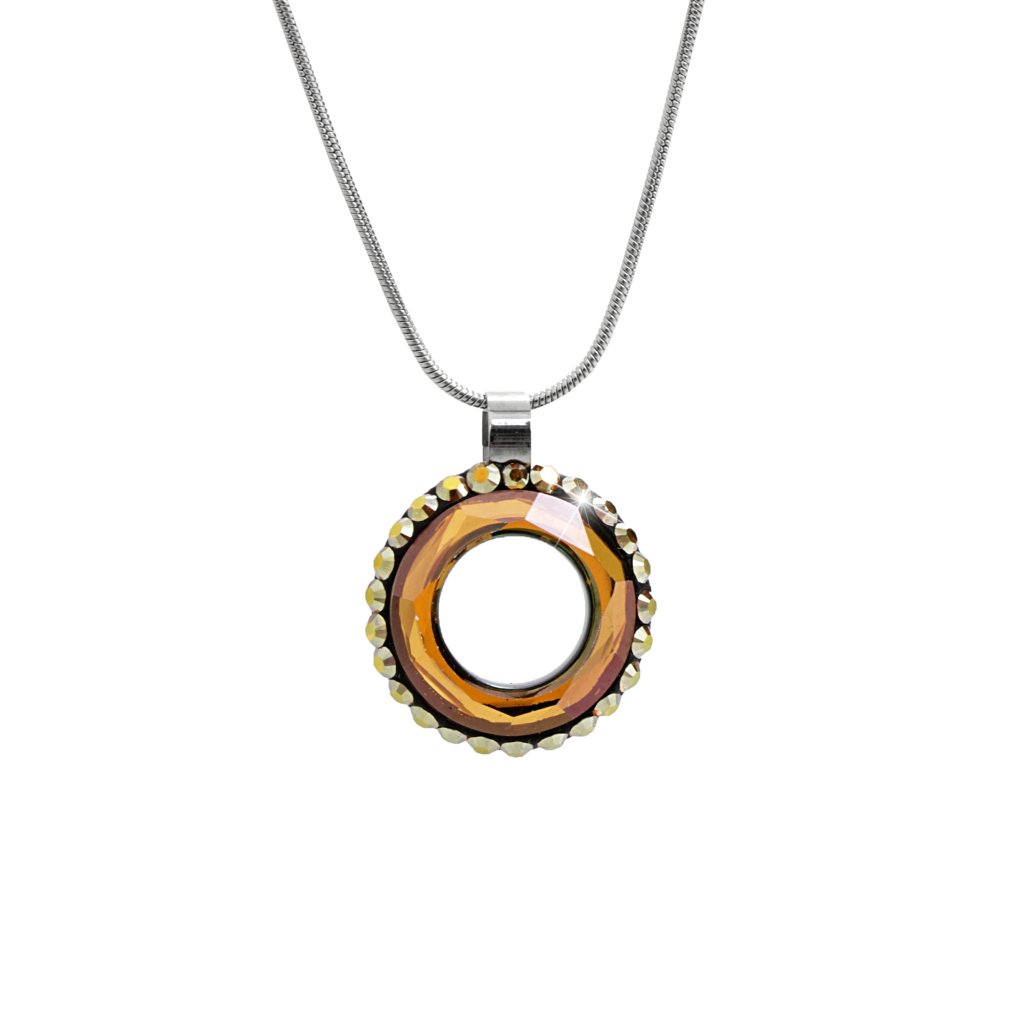 Náhrdelník je vyroben ze směsi kovů, využívaných pro bižuterii, a to zinku a mědi tzv. mosazi s povrchovou úpravou Rhodium. Díky Rhodiu dostane šperk tu pravou zář a lesk. Samotný přívěšek je ve tvaru kolečka, kdy kruh je symbol jednoty a dokonalosti ale také nekonečnosti či věčnosti. Blyštivost náhrdelníku zdůrazní kameny Swarovski v barvě Topaz. Jako bonus Vám šperk zabalíme do dárkové krabičky.