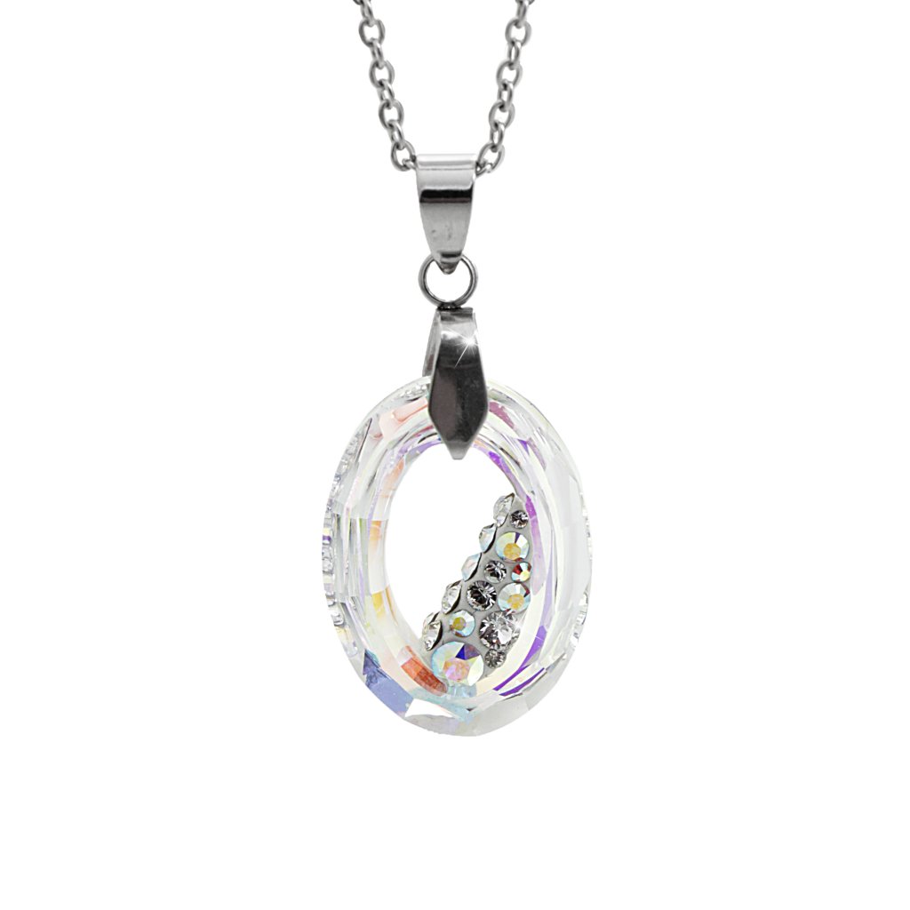Unikání náhrdelník ve tvaru oválu, uvnitř zčásti vyplněn Swarovski kamínky v barvě Aurore Boreale. Na povrchu šperku je použito Rhodium pro lesk a záři ale také proti zčernání a je vhodný pro alergiky na stříbro.