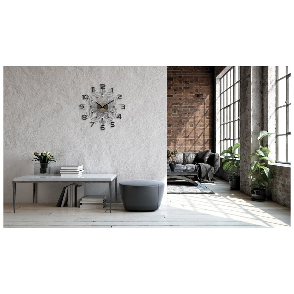 Nástěnné hodiny antracit s čísly, jejichž pravidelné čáry připomínají paprsky slunce, zdobí kameny v kapkovitém tvaru a velká výrazná čísla v barvě hodin.