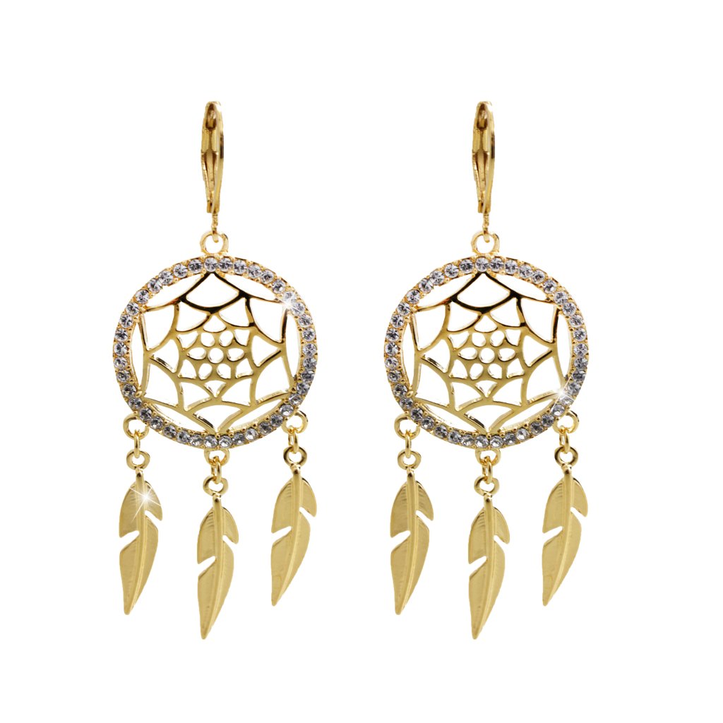 Výraznější šperk v podobě lapačů snů je vyroben z bižuterní směsi kovů přičemž ale povrch je pozlacený a šperk krásně lesklý. Okraj kruhu je osázen kamínky Swarovki v barvě Crystal, které náušnicím dodají krásný třpyt. Stará legenda vypráví o tom, že první lapač snů na světě vytvořila indiánka na radu šamana. S tímto ochranným amuletem mělo její dítě v noci přestat plakat a také přestalo. Zavěsila jej nad místo, kde dítě každou noc spinkalo.