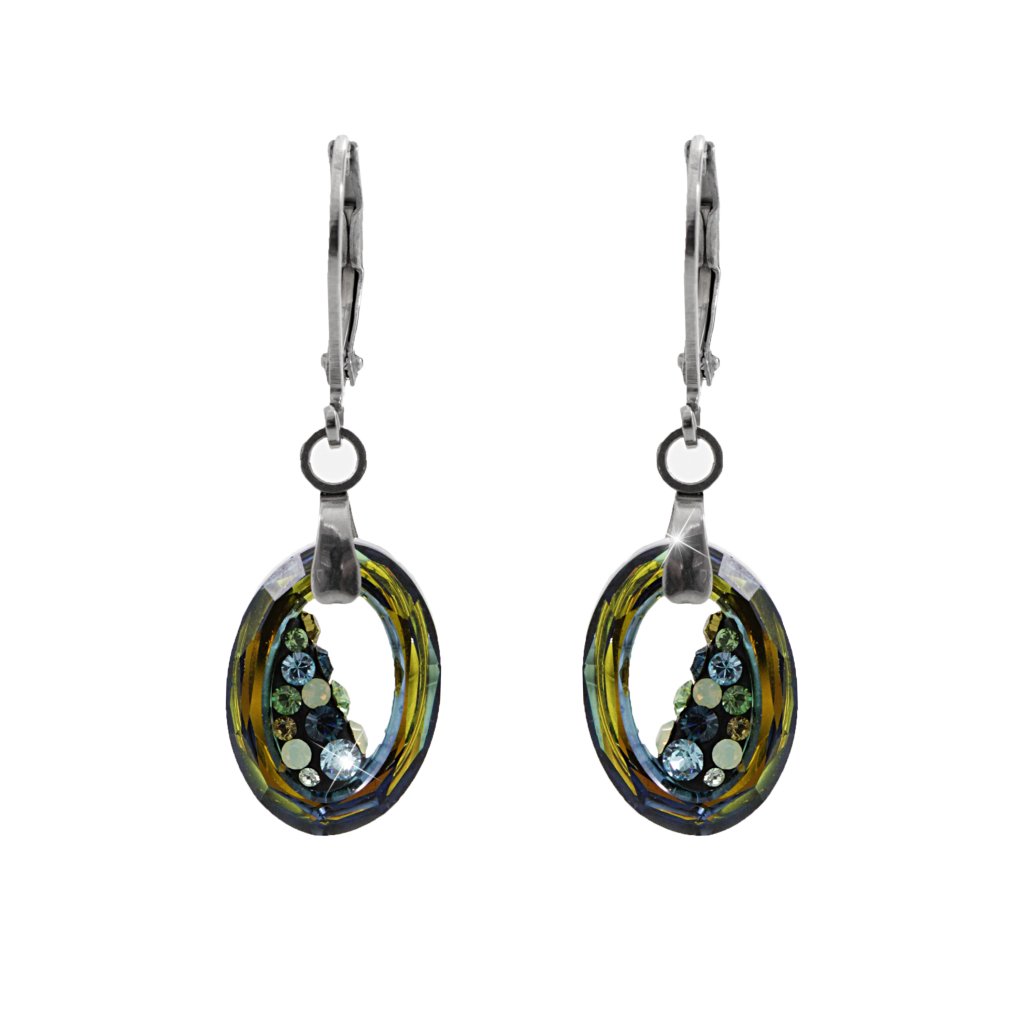 Oválné ručně vyráběné náušnice ve tvaru oválu jsou z části vyplněny kamínky Swarovski, které hrají všemi barvami. Ozdobte se jednoduchým přesto elegantním šperkem.