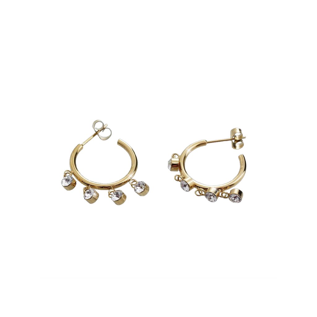 Jemné náušničky ve stříbrné barvě jsou vyrobeny z chirurgické oceli, která je velice odolná vůči oděru a je antialergenní. Kroužky náušnic jsou zdobeny pohyblivými ozdůbkami v podobě kamínků Swarovski v barvě Crystal. Kruhy jsou považovány za vysoce elegantní a nadčasovou volbu. Podle velikosti a zpracování mohou být jak univerzálním šperkem, tak statement kouskem na stylovou party.