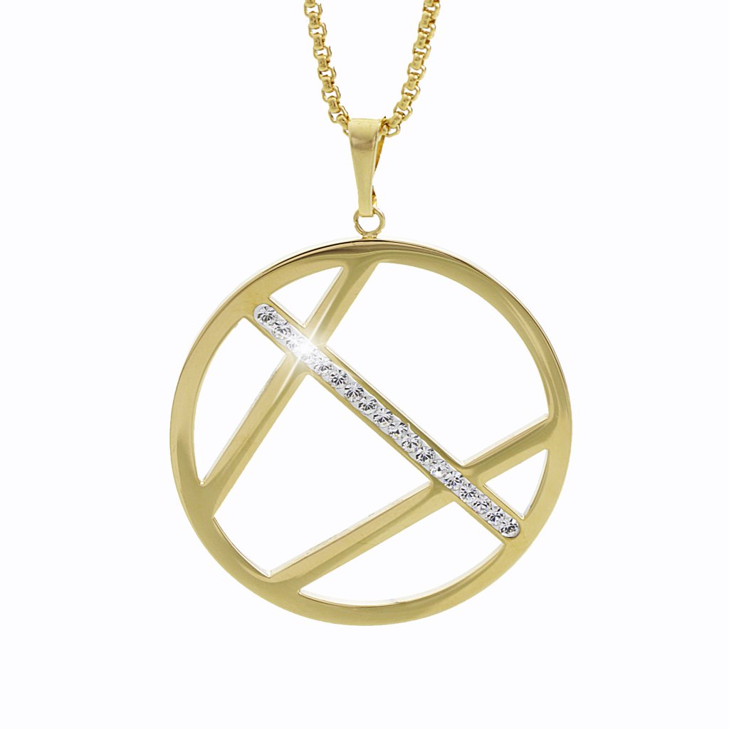 Náhrdelník zlaté barvy ve tvaru kruhu je vyplněn linkami mohoucí připomínat praskliny. Celý šperk je vyroben z chirurgické oceli, která je velice odolná vůči oděru a je antialergenní. Jedna z linek (prasklin) v kruhu je vysázena kamínky Swarovski v barvě Crystal. Náhrdelník lze vrstvit více náhrdelníky a krásně zdokonalit svůj dekolt.