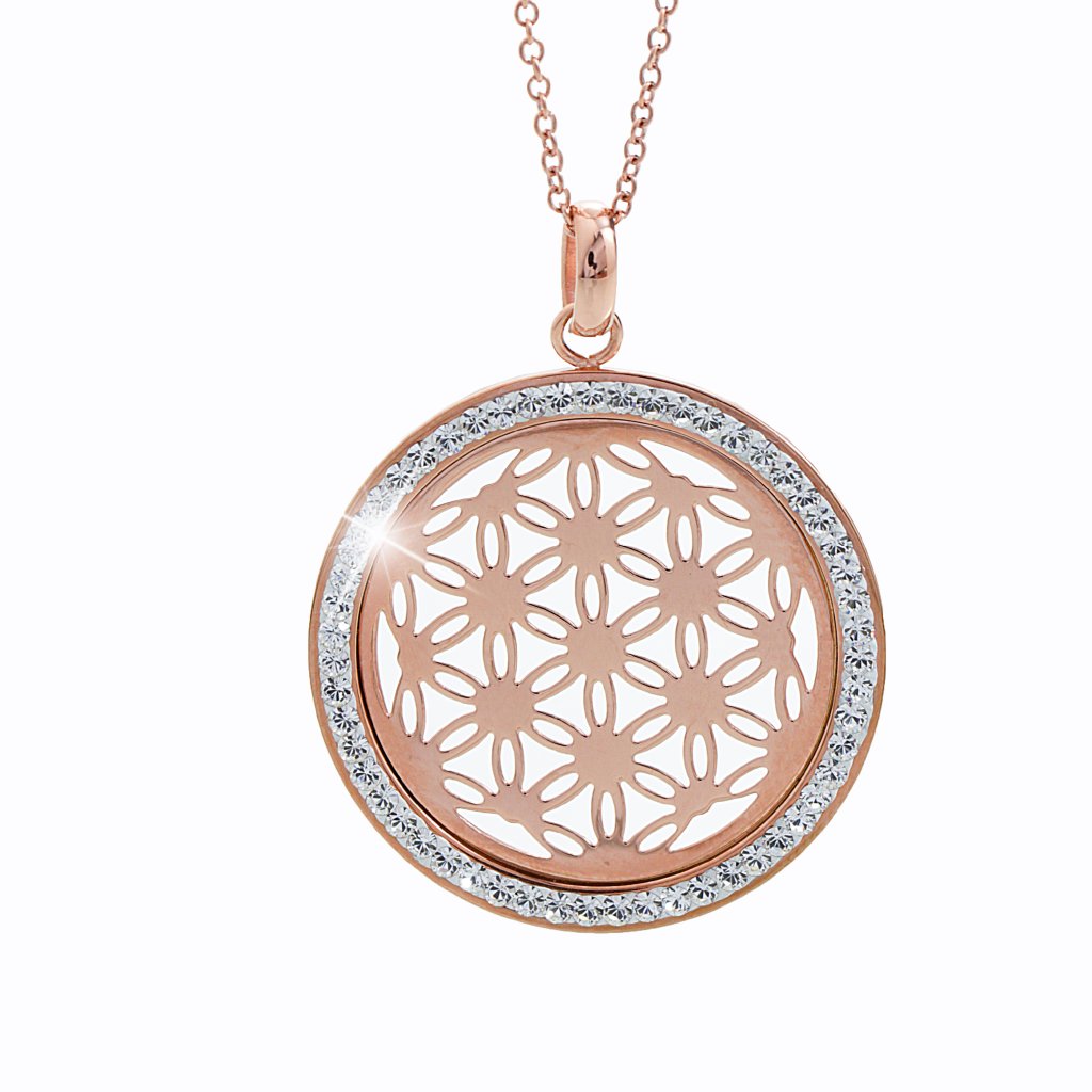 Elegantní šperk vyroben z chirurgické oceli v barvě Rose Gold, která je velice moderní díky své odolnosti vůči oděru a je antialergenní. Okraj kruhu je osázen kamínky Swarovski v barvě Crystal. Tento šperk je dostupný i ve zlaté či stříbrné barvě. Květ života je považován za symbol obsahující veškerou geometrii života, tak jak jej známe na planetě Zemi. Je to univerzální symbol energie, života a spojení mezi vším existujícím.