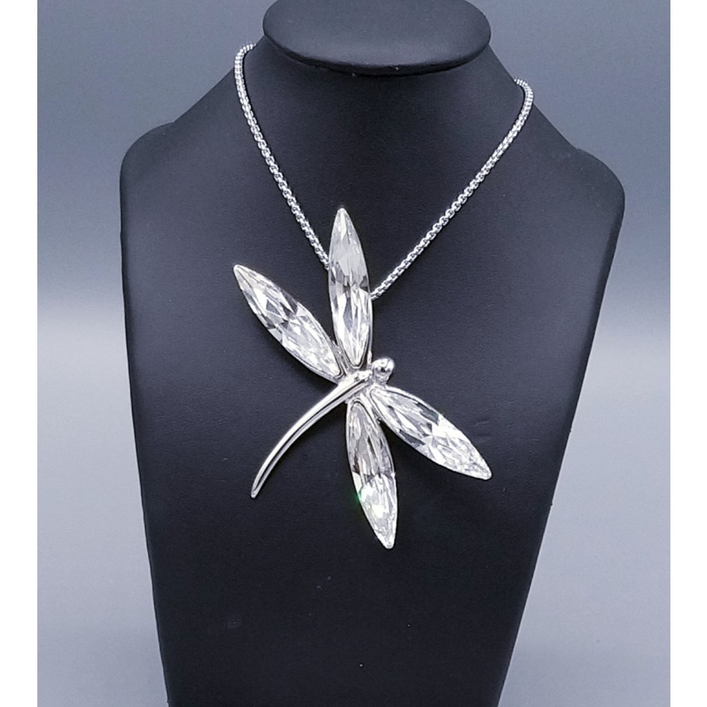 Přívěsek s motivem vážky, jejíž křídla jsou tvořena navetami (úzký dlouhý výbrus kamene) v čiré barvě Crystal. Povrchová úprava Rhodium pro zvýšené odolnosti a lesk.