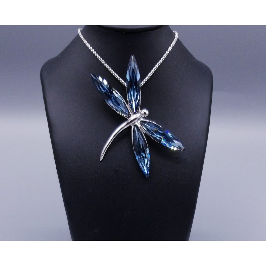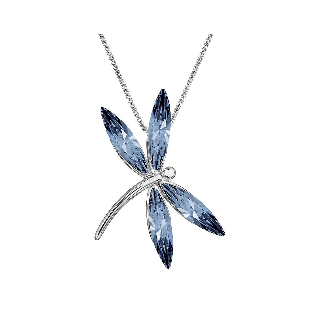 Přívěsek s motivem vážky, jejíž křídla jsou tvořena navetami (úzký dlouhý výbrus kamene) ve výrazné barvě Denim Blue. Povrchová úprava Rhodium pro zvýšené odolnosti a lesk.