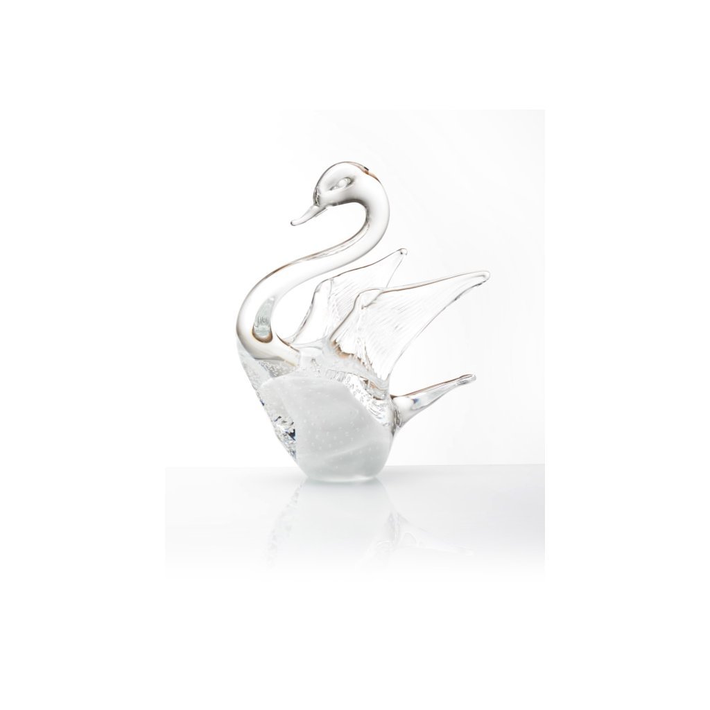 Ručně tvarovaná velká skleněná bílá labuť s bublinkami, kterou lze kombinovat do páru, jsou vhodné jako svatební dar, přičemž je například lze dát na skleněný podnos a nechat vypískovat datum svatby nebo jméno nevěsty a ženicha. je hezkou dekorací do interiéru a poslouží i jako těžítko. Díky ruční výrobě se dá každý kus označit za originál.