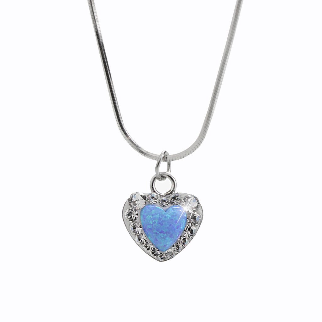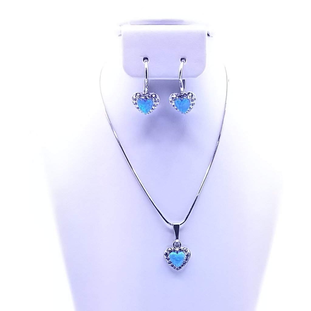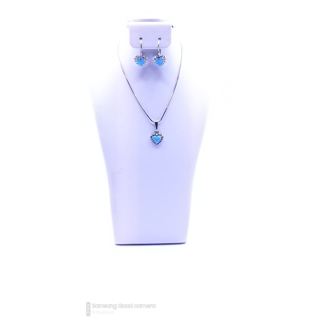 Stříbrná souprava srdíčko s modrým opálkem, je velmi krásným šperkem. Kamínky Swarovski , kterými je šperk osázen zvýrazní jasnou barvu opálku.