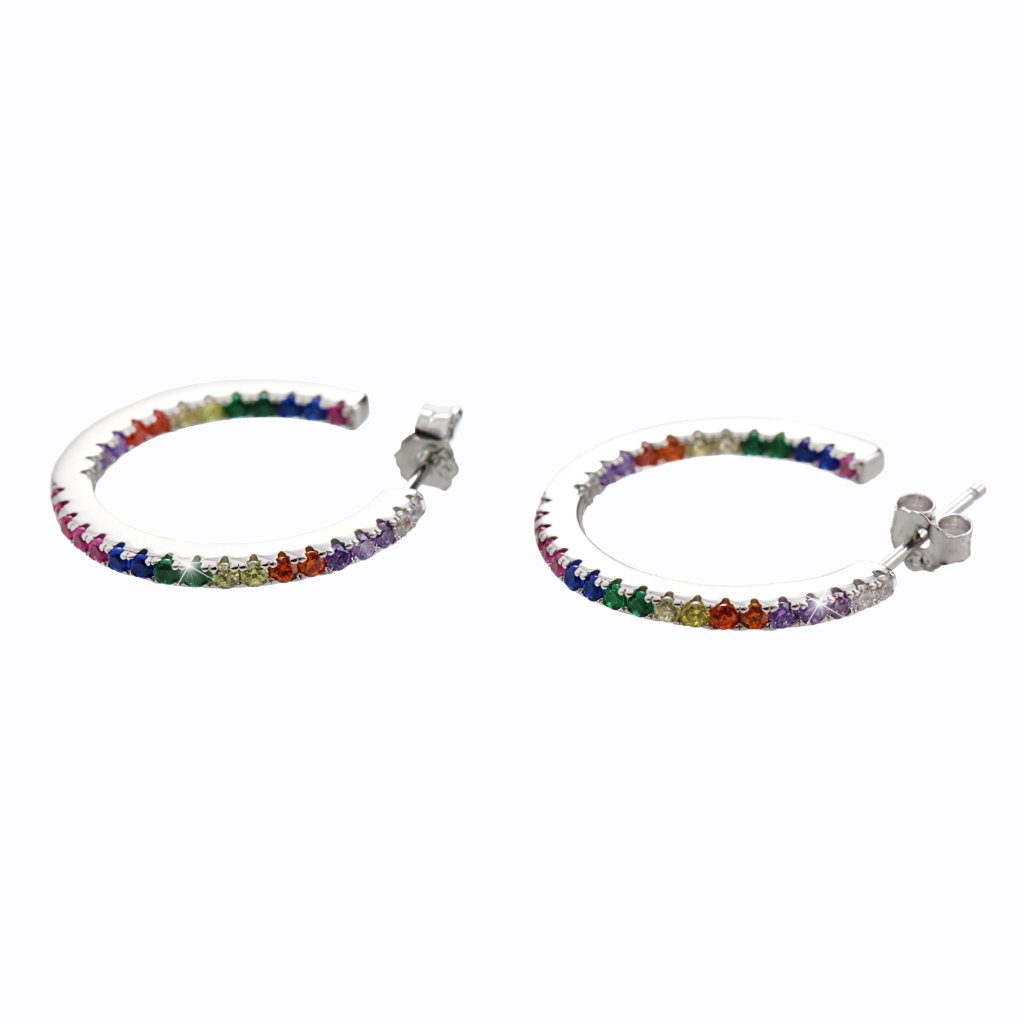 Tyto náušnice jsou klasické, nestárnoucí kruhy oživené barevnou škálou zirkonů. Náušnice jsou mladistvé, elegantní a moderní.