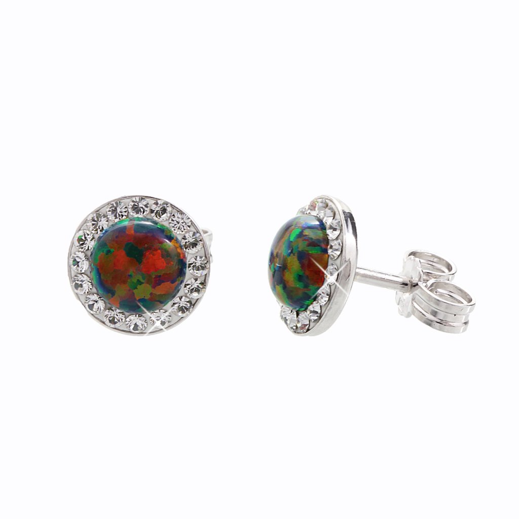 Náušnice jsou vyrobeny z puncovaného stříbra 925/1000 s povrchovou úpravou rhodium, která prodlužuje životnost a zářivost šperku. Opál je synteticky vyrobený a osázený kameny Swarovski, ty rozjasňují barvu opálků.
