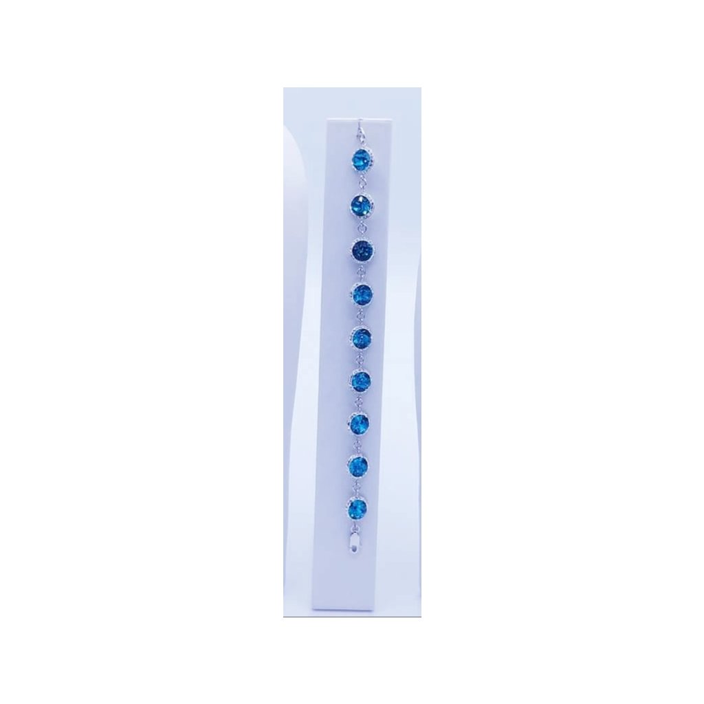 Stříbrný náramek s kameny Swarovski Šaton blue. Stříbro (925/1000), často rhodiované pro dlouhotrvající lesk a vyšší odolnost proti zčernání.Povrchová úprava rhodiem dodává šperku vysoký lesk, pevnost a odolnost vůči zčernání stříbra. Kulaté krystaly s precizním brusem, které zajišťují brilanci a eleganci.Vhodný dárek pro každou ženu a dívku.Vyjadřují luxus, světlo a eleganci.Vhodný pro slavnostní události, svatby, večírky i každodenní nošení.